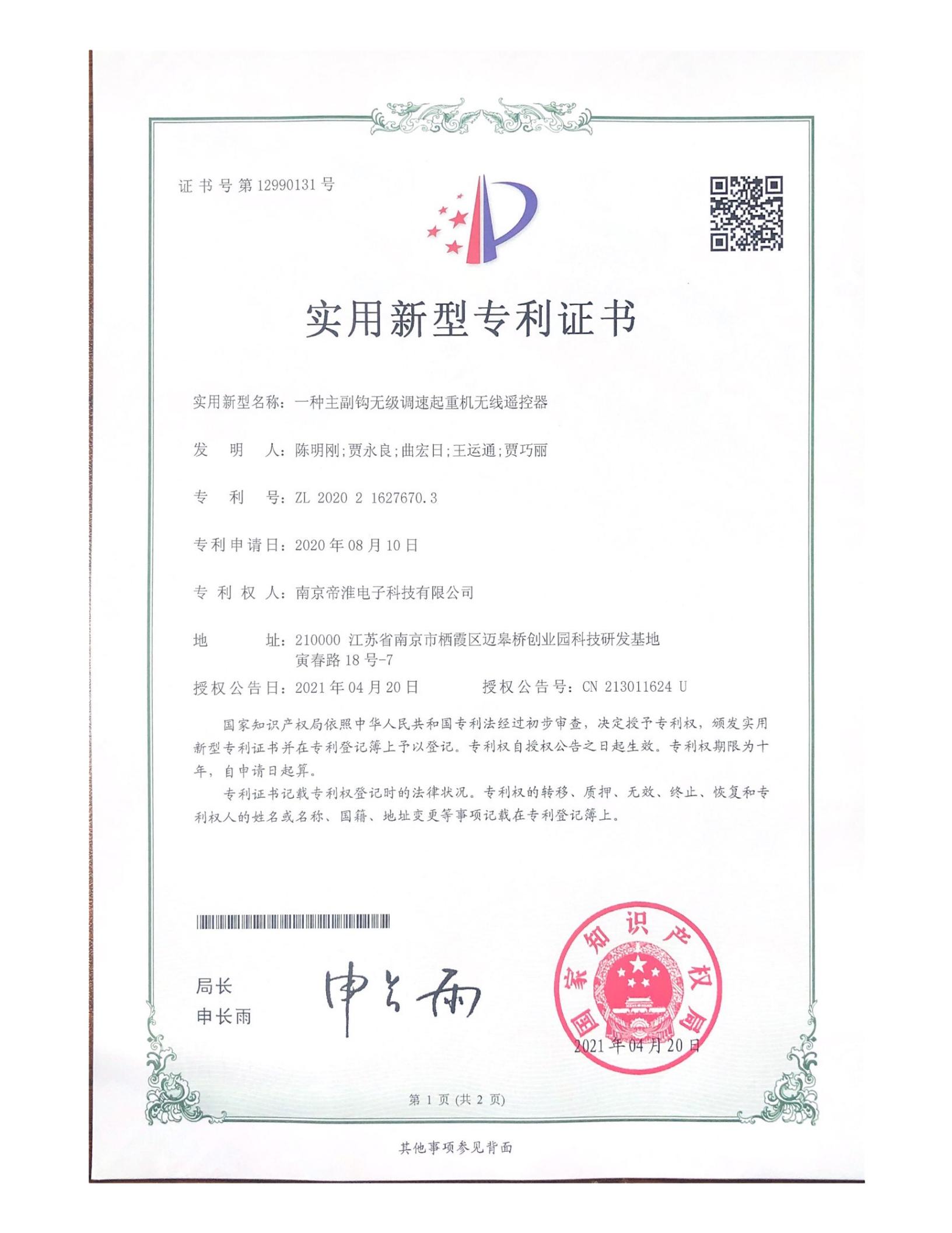 南京帝淮电子科技有限公司,国内工业遥控器行业领军企业,自主研发、定制、非标设计各类工业级无线遥控器、工业级有线控制器、智能化自主算法逻辑的本地控制器等系列产品。已经申请及正在申请的技术专利、外观专利有近三十项左右,并通过了CE欧盟认证、国家级试验检验报告、EMC电磁兼容认证等。